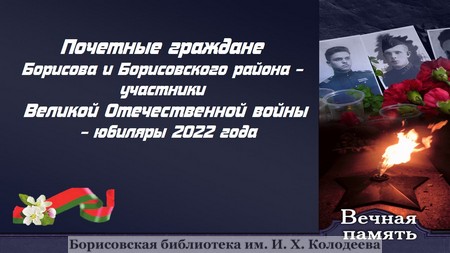 Почетные граждане Борисова и Борисовского района – участники Великой Отечественной войны – юбиляры 2022 года Предыдущая статья Утраченные достопримечательности Борисова: кинотеатр «Родина» Следующая статья Церкви борисовских Благочиний на рубеже XIX-XX вв. Оформление Мин. Малинький Средний Большой Макс. По умолчанию Helvetica Segoe Georgia Times Режим чтения Поделиться Виртуальная выставка Краеведческого центра 2022-04-20 Предыдущая статья Утраченные достопримечательности Борисова: кинотеатр «Родина» Следующая статья Церкви борисовских Благочиний на рубеже XIX-XX вв.