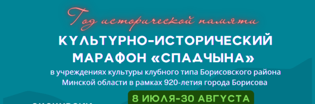 В рамках Года исторической памяти с 8 июля по 30 августа 2022 года в клубных учреждениях Борисовского района проводится культурно-исторический марафон «Спадчына». Организаторы ГУК «Районный центр народного творчества». Участники - работники культуры, дети, родители, молодежь.
