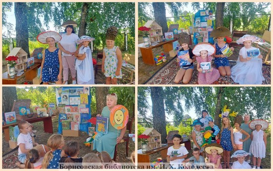 Разместившись на импровизированом ковре-самолете под тенью берёз, ребята отправились в увлекательное путешествие на планету “Чыталія”, где встретились с героями книг современных белорусских авторов. Библиотекарь Н.Матюшонок подготовила к встрече с детьми выставку-инсталляцию «Чытаем кнігі беларускіх аўтараў», на которой были представлены не только книги, но и дополняющие их содержание реквизиты. С неподдельным интересом дети слушали методиста отдела маркетинга Людмилу Захаревич, которая приехала к нам на встречу не с пустыми руками, а привезла с собой аксессуары к некоторым книгам современных белорусских писателей. Необходимо отметить, что ребята нашей библиотеки прочитали многие из тех книг, о которых говорила Людмила Брониславовна, поэтому были приятно удивлены, увидев, что герои полюбившихся им книг нашли воплощение в шляпках, мягких игрушках, выполненных из войлока и других предметах. По окончанию путешествия дети с огромным желанием проявили свои таланты и с воодушевлением, наперебой примеряли образы грибов по книге «Сакрэты аднаго каралеўства» Е.Хадасевич-Лисовой, хотели стать принцессами из сказки «Прынцэса Алівія і «жабіны вочкі» Н.Бучинской, знакомились с Лахнесской, Апполоником и Волком из сказок Е. Масло «Мяне завуць Лахнэска» и «Лагодны воўк», играли в жителей домика по сказкам Н.Ясминска «Дом цікаўных казак», прогуливались с куклой Машей из книги Т.Даморёнок «Маша і яе чароўны лес”, примеряли маску Нулика из книги «Прыгоды Нулика» В.Липского, а в заключение мероприятия получили сладкие призы и открытки с изображениями литературных героев, из волшебной кошелки, о которой идет речь в книге Т.Бунто “Чароўны кошык”.