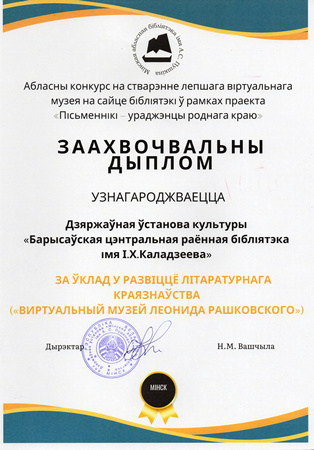 За стварэнне і работу над віртуальным музеем Леаніда Рашкоўскага ДУК “Барысаўская цэнтральная раённая бібліятэка імя І.Х. Каладзеева” атрымала заахвочвальны дыплом – за ўклад у развіццё літаратурнага краязнаўства.