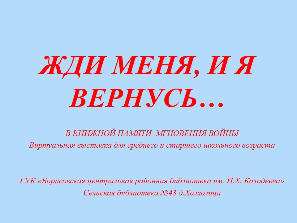 Сельская библиотека № 43 д. Холхолица представляет виртуальную книжную выставку "Жди меня, и я вернусь...", посвященная Дню Победы
