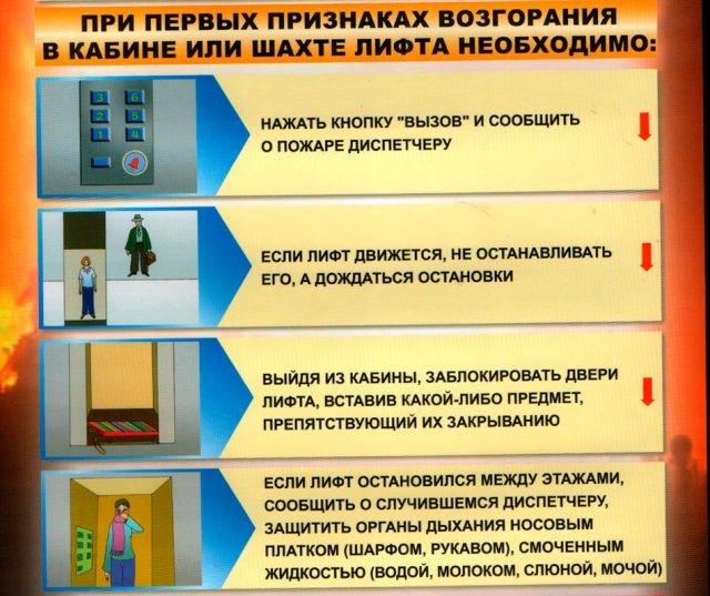 При появлении признаков начала возгорания немедленно нажми кнопку вызова и четко сообщи о происшествии диспетчеру. Не пытайся перенаправить лифт к этажу самостоятельно (может возникнуть ошибка и машина просто остановится).