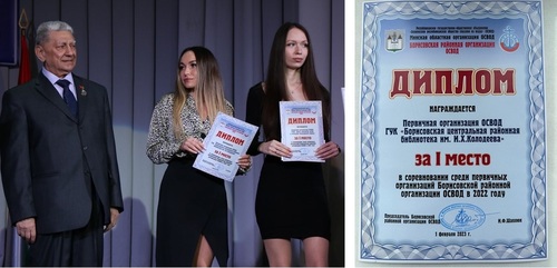 На собрании прошло награждение Дипломом Президиума Минского областного совета ОСВОД первички ГУК «Борисовская центральная районная библиотека им. И. Х. Колодеева» за І-е место в соревновании среди первичных организаций Борисовской районной организации ОСВОД в 2022 году.