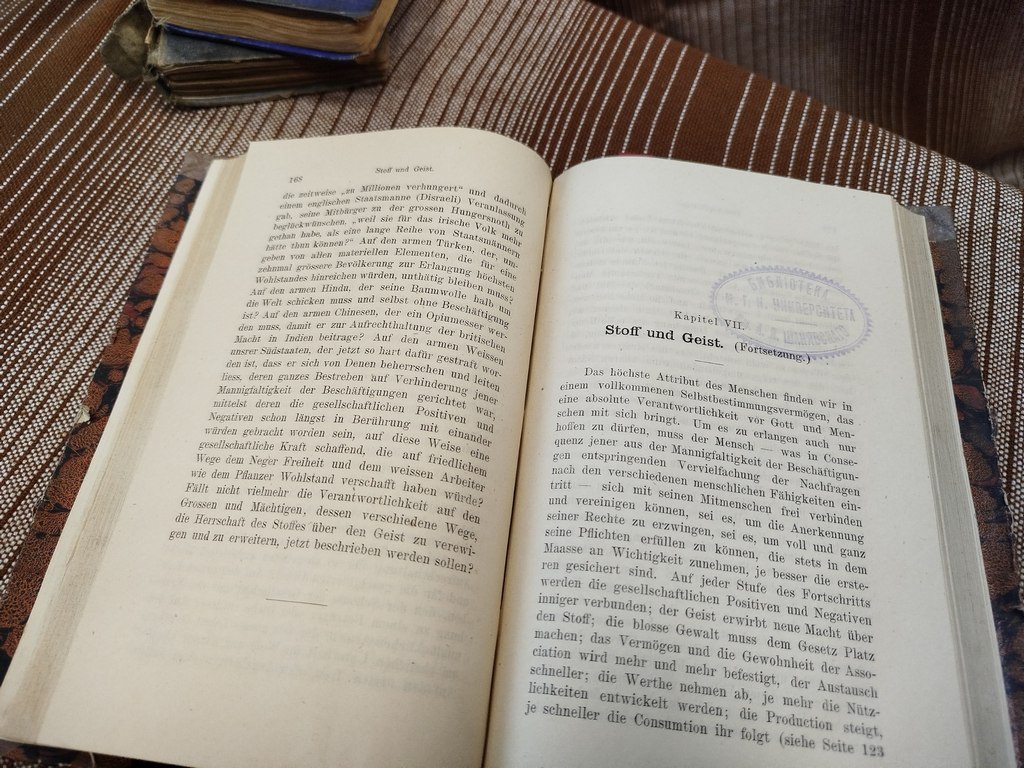 В экспозиции «Редкая книга» представлено немецкое издание 1878 г. — социологический труд Генри Чарлза Кэри «Единство законов: соотношение физической, общественной, психологической и этической наук».