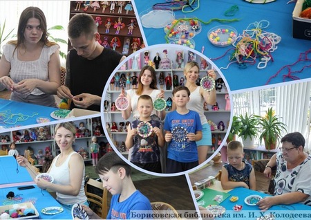 Участники мероприятия получили заготовки, сделанные из одноразовых пластиковых тарелок, под руководством билиотекаря сплели из цветных вязальных ниток сердцевину поделки, украшая ее бусинами. Затем каждый по желанию оформил ободок изделия и прикрепил к нему подвески с бусинами-перышками.