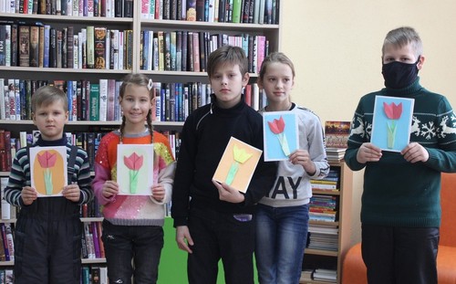В преддверии 8 Марта участники мероприятия своими руками делали открытки к этому празднику. Вначале дети подготовили и оформили заготовки для открыток, а затем украсили их цветком тюльпана, сложенным в технике оригами.