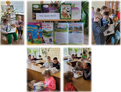 В ходе встречи ребята с удовольствием читали и слушали стихи о лете, познакомились с тематической книжной выставкой «Что такое лето?», играли в игры «Отгадай загадку», «Доскажи пословицу», «Угадай животное». Школьники активно принимали участие в слайд-беседе «Летний календарь» о явлениях природы, приметах, всех летних месяцах. Ребятам очень понравились музыкальные ролики «Привет, лето!» и «Каникулы». В завершение встречи прошли самостоятельные «Минутки чтения» и дети с интересом читали понравившиеся детские книги и журналы.