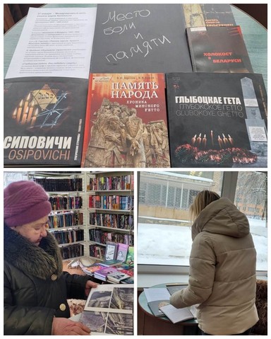 Вниманию пользователей библиотеки была представлена тематическая полка с книгами, которые рассказывают о трагических страшных страницах нашей истории, о событиях, которые привели к гибели тысячи наших земляков. Из книги Герстена Б.И., Бокуна В.В. «Память народа. Хроника Минского гетто»: «Вина этих людей перед врагами была только в их национальности. Фашистские захватчики, которые хозяйничали на белорусской земле, вынесли смертный приговор всем нашим землякам еврейской национальности...». А также были представлены книги «Холокост в Беларуси 1941-1944 Документы и материалы», «Лагерь смерти Тростинец», «Глубокское гетто. Они победили смерть», Н. Цыганок «Осиповичи: трагические страницы».