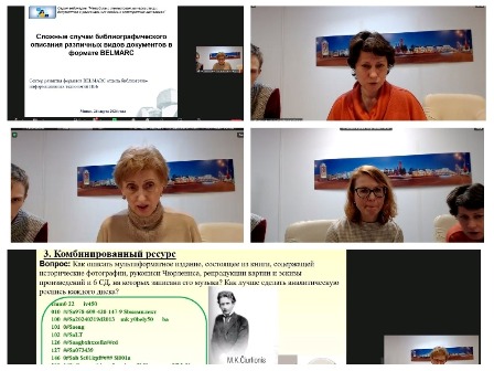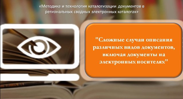 26 марта 2024 года каталогизаторы отдела организации комплектования и использования единого фонда и заведующая сектора автоматизации и электронного каталога приняли участие в очередном вебинаре из серии «Методика и технология каталогизации документов в региональных сводных электронных каталогах» на тему «Сложные случаи описания различных видов документов, включая документы на электронных носителях» в онлайн режиме.