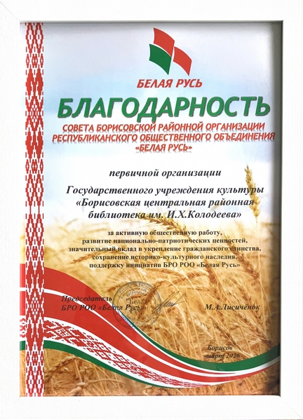 Приятным моментом стало награждение первичных организаций Борисовской районной организации РОО «Белая Русь». В числе достойных – первичная организация ГУК «Борисовская центральная районная библиотека им. И.Х. Колодеева» – за активную общественную работу, развитие национально-патриотических ценностей, значительный вклад в укрепление гражданского единства, сохранение историко-культурного наследия, поддержку инициатив БРО РОО «Белая Русь». Председатель БРО РОО «Белая Русь» Мария Лисичёнок вручила Елене Копыток Благодарность.