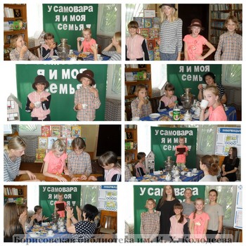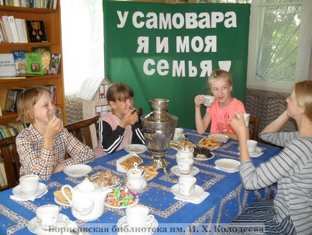 11 июля в 12.00 в Черневическом СК-б прошло очередное заседание семейного клуба «Семья в трёх поколениях». На наших совместных консультациях с родителями мы придумывали, какие могут быть праздники дома, в клубе, библиотеке. Разнообразие детско-взрослого интереса способствует «рождению» праздника, которые объединены радостью подлинного веселья, необычности ситуации. И взрослые, и дети живут в ожидании такого праздника, полного смеха, сюрпризов, нарядов и радости. Реализация цели совместной деятельности нашло отражение в семейном празднике «У самовара я и моя семья». В ходе мероприятия большой интерес у детей вызвал мини-музей в картинках «Русский самовар» работа в музее помогла всем участникам заглянуть в прошлое, узнать о происхождении самовара и его предназначение. Придумывали сказки-истории о самоваре, читали стихи о самоваре, чае, о «Пузатом чайнике», слушали народные песни «Пряники русские», «Блины», «У самовара». Приняли участие в играх «Комплименты самовару», «В семье все поровну», «Сундучок», пропели шуточные частушечные куплеты, продемонстрировали танец «Чаёвниц». А в завершение мероприятия собралось у самовара дружное семейство, почаёвничать мы любим за беседой вместе!