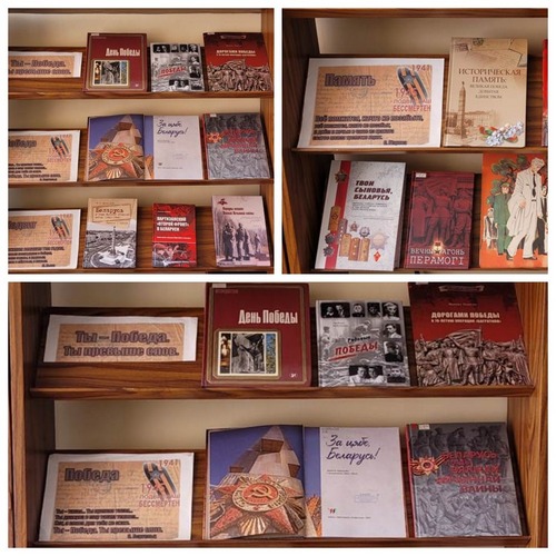 На выставке представлены книги: М. Никитин «Дорогами Победы» об операции «Багратион», Л. Рейзина «Рядовые победы» построена на беседах с героями очерков, материалах их дневников и воспоминаний. «За цябе, Беларусь!: хроніка барацьбы беларускага народа з нямецка-фашысцкімі захопнікамі у 1941-1944 гадах» и В. Ермаловіч «Беларусь у гады Вялікай Айчыннай вайны» на достоверных исторических фактах и материалах рассматриваются основные события. В книге Н. Смирнова «Партизанский «второй фронт» в Беларуси» речь идёт о событиях и фактах героической борьбы на оккупированной врагом территории Беларуси сотрудников органов государственной безопасности СССР и БССР совместно с местным населением в ходе осуществления своей разведывательно-диверсионной деятельности против нацистских оккупантов. «Беларусь помнит. Минщина гордится» содержит биографические сведения о ветеранах Великой Отечественной войны, проживающих в Минской области. «Твои сыновья, Беларусь» содержит биографии маршалов, генералов и адмиралов СССР – белорусов и уроженцев Беларуси, участников Великой Отечественной войны.