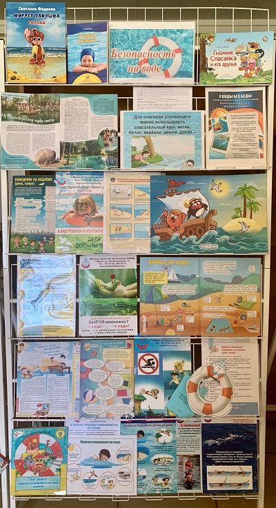 На выставке представлена информация по безопасности на водных объектах, оказании первой доврачебной медицинской помощи, а также история ОСВОД. Юные читатели могут ознакомиться с занимательными рассказами А.Шарко «Гномик Спасайка и его друзья» и Г.Авласенко «Как зверята правила безопасности на воде изучали». Взрослым посетителям библиотеки будет интересно пособие Г.Бережной «Учимся плавать», а также брошюры соответствующей тематики и памятки по мерам безопасности при купании в водоемах.