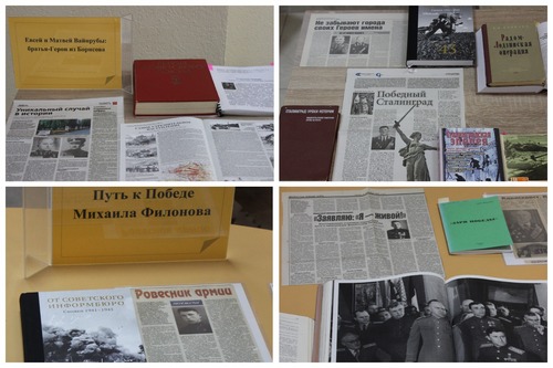Вниманию читателей предложены персональные выставки «Евсей и Матвей Вайнрубы: братья-Герои из Борисова» (из серии «Почетный гражданин Борисовского района – участник Великой Отечественной войны») и «Путь к Победе Михаила Филонова». Наши земляки сражались за Родину на самых разных, порой очень тяжелых фронтах – Москва, Вязьма, Ельня, Тула, Орел, Ленинград, Сталинград, города Украины, Беларуси, Прибалтики… Внесли свой вклад и в освобождение Европы: с боями прошли Польшу, приняли участие в победной Берлинской операции, когда советские войска окончательно сокрушили немецко-фашистскую военную машину. Каждый из героев выставок, при определенной общности военных и фронтовых судеб, имеет свои уникальные судьбоносные моменты биографий – на них и сделаны акценты при подборе документов для экспонирования.