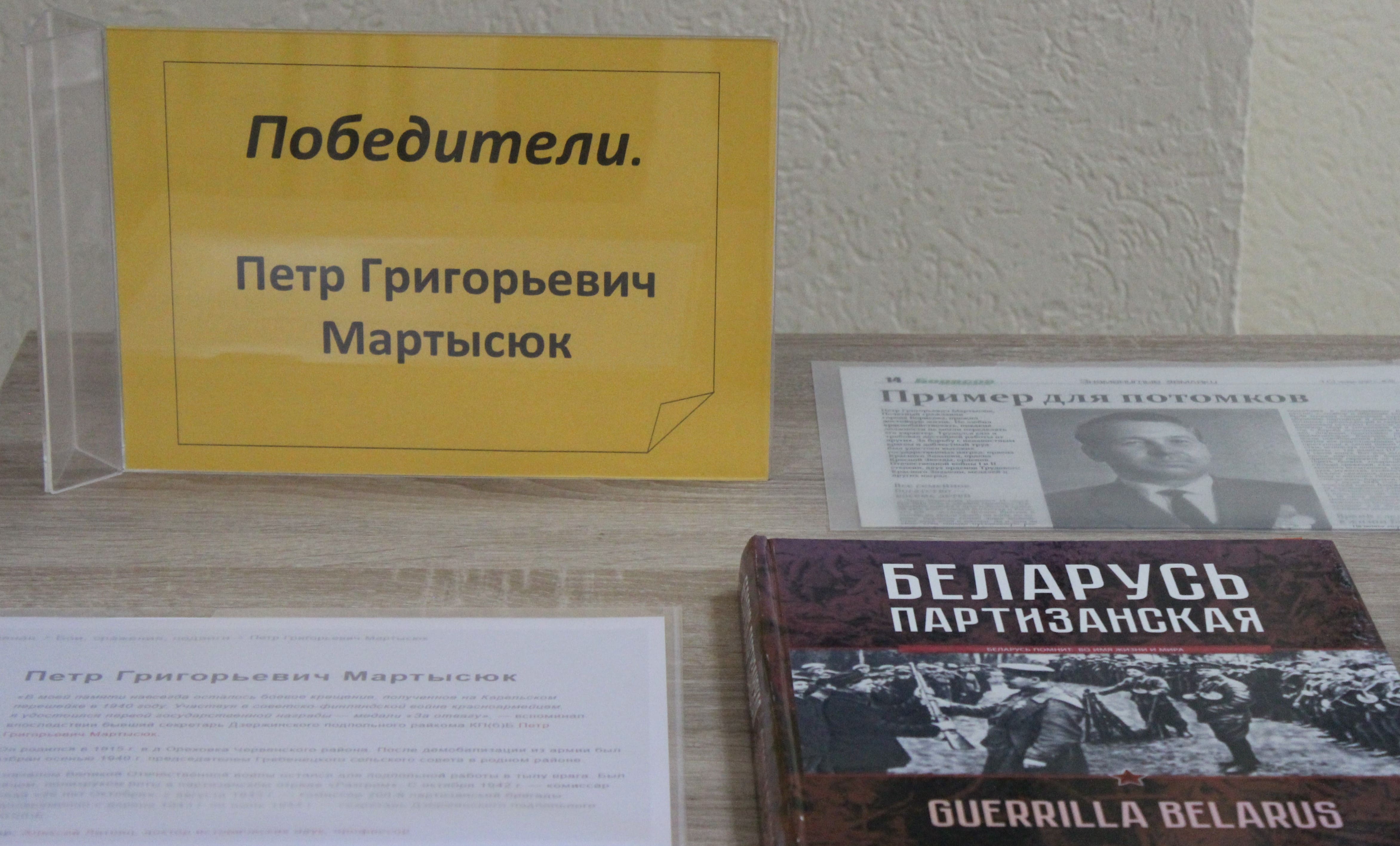 В настоящее время в зале функционирует выставка «Победители. Петр Григорьевич Мартысюк». Он прожил достойную жизнь, отмеченную личным вкладом в развитие сельского хозяйства довоенной Беларуси, в дело борьбы за независимость Родины в движении Сопротивления на территории родной Беларуси в годы Великой Отечественной войны, в послевоенное восстановление республики, в ее дальнейшее поступательное развитие как одной из передовых республик Советского Союза.