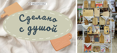 В детско-юношеском отделе центральной библиотеки с 15 апреля стала работать вставка-инсталляция «Сделано с душой», посвященная предмету кухонной утвари – разделочной доске, как объекту исторического и культурного наследия.