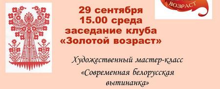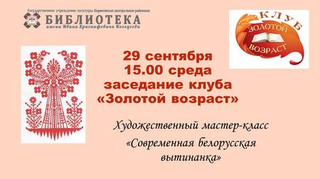 29 сентября в 15-00 сотрудник Абонемента Ракицкая Людмила Владимировна приглашает участников клуба «Золотой возраст» на художественный мастер-класс по мотивам современной белорусской вытинанки.