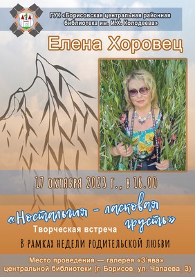 В рамках недели родительской любви 17 октября в галерее «З’ява» пройдёт творческая встреча «Ностальгия – ласковая грусть» с поэтом-песенником, членом Союза писателей Беларуси Еленой Хоровец.