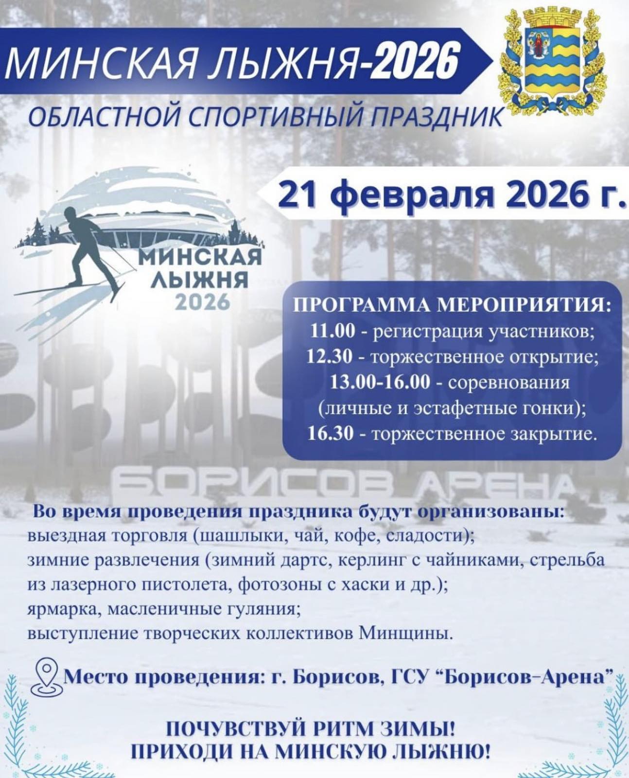 Областной спортивный праздник «Минская лыжня — 2026» впервые состоится в «Борисов-Арене» 21 февраля.