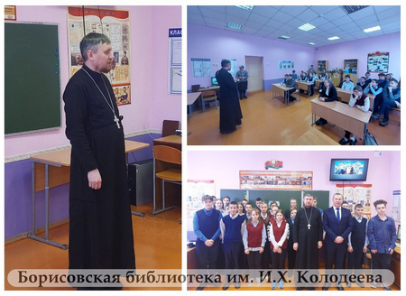 В этот день в ГУО «Кищина Слободская средняя школа Борисовского района» состоялась встреча настоятеля Храма Святой Живоначальной Троицы д. Бытча иерея Василия Рубцова с учащимися школы.