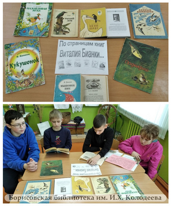 Из рассказа библиотекаря Микулович Светланы ребята узнали, что в своем творчестве Виталий Бианки часто описывал жизнь животных и природу, а в протяжении всего своего литературного пути писатель старался привить детям любовь к природе и уважение к живым существам. Его часто называют «лесным корреспондентом», «лесным сказочником». Книги Бианки помогают найти ключи к разным тайнам окружающего мира. Среди самых известных произведений и книг Бианки: «Подкидыш», «Лис и мышонок», «Лесная газета», «Рассказы Бианки», «Чей нос лучше», «Синичкин календарь», «Кукушонок» и др. Создавая свои произведения, он стремился и ребят приучить к самостоятельным наблюдениям за родной природой.
