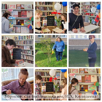 Вниманию читателей была представлена тематическая выставка «Мир. Труд. Май» с книгами, открытками, листовками, посвящёнными истории празднования 1 мая. Взрослые читатели участвовали в блиц-опросе «Что для вас значит праздник 1 мая?». Сотрудники библиотеки совершили трудовой десант во дворе библиотеки. На лужайке на радость маленьким читателям вновь поселились колобок и пчёлка из камня.