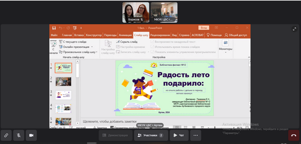 О формах работы с детским читателем летом рассказали представители четырёх библиотек Артёмовского городского округа. Так, библиотека-филиал №7 подготовила презентацию на тему «Лето – время познавать, играя», библиотека-филиал № 5 – «Модельная библиотека – филиал № 5 г. Артема», центральная детская библиотека им. А. С. Макаренко – «Лето, книги, детвора», а библиотека-филиал № 12 – «Радость лето подарило: опыт работы с детьми в период летних каникул». Все выступления были информативны и интересны, отдельные моменты работы взяты борисовчанами на заметку, чтобы, учитывая специфику работы отдела, апробировать их в своей трудовой деятельности.
