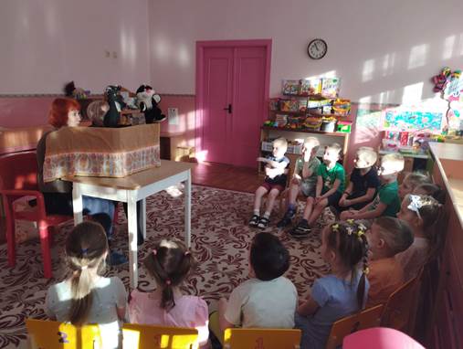 Вниманию малышей был представлен кукольный спектакль по сказке Т. Караманенко «Вот это фокус!». Ребята с удовольствием посмотрели забавную историю про кота-хвастунишку, которого ловко проучил пес Барбос. После спектакля дошколята ответили на вопросы по сказке и поучаствовали в викторине загадок.