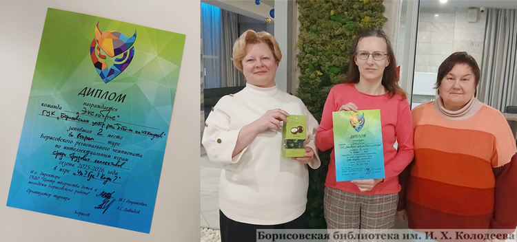 25 ноября состоялся второй тур Борисовского регионального чемпионата по интеллектуальным играм. Команда библиотеки «Экслибрис» в составе Натальи Олейник, Натальи Горидько и Натальи Захаренко заняла второе место среди трудовых коллективов.