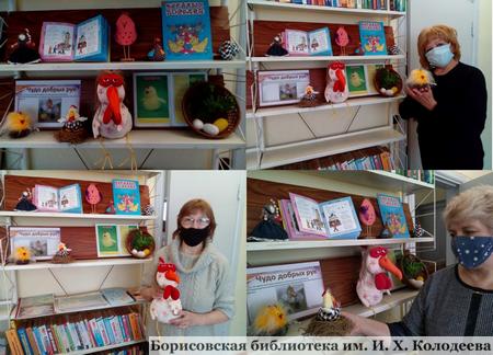 Воспитанники отделения дневного пребывания инвалидов ГУ «Территориальный центр социального обслуживания населения Борисовского района» предоставили на выставку свои работы – это милые цыплятки и петушок, кукла-девочка с веточкой вербы. Выставка создала у всех посетителей библиотеки чудесное весеннее настроение.