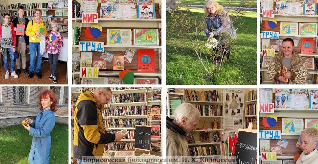 Во дворе библиотеки состоялся трудовой десант. В этот день сотрудниками библиотеки были облагорожены декоративные кусты на зелёном газоне, а также своё место заняли каменные расписные колобок и пчёлка. Для всех посетителей библиотеки прошли информационные минутки у тематической полки «Мир. Труд. Май», на которой были представлены книги, открытки, листовки, посвященные истории праздника 1 мая. Все читатели с интересом принимали участие в информационных минутках и были очень рады живому познавательному общению в библиотеке.