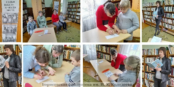Мероприятие проводилось в рамках республиканской акции «Моя семья – моя страна», посвящённой Международному дню семьи. Присутствующие ознакомились с материалами книжной выставки «Моя семья – моя радость». Ведущая Лариса Шкредова предложила участникам встречи обсудить притчу о тепле семейного очага и придумать свою формулу счастья при помощи слов. Ребята и родители ответили на вопросы викторины «Волшебное лукошко», приняли участие в игре «Ассоциации», в конкурсе «Пословица недаром молвится». В заключение каждая семья изготовила праздничную открытку ко Дню семьи.