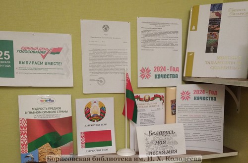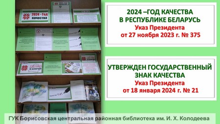 «2024 – Год качества». Центр правовой информации Борисовской центральной библиотеки приглашает познакомиться с правовыми документами и другими материалами информационно-книжной выставки, посвященной Году качества. Девиз 2024 года: «Качество во всем — залог процветания Беларуси». Качество — это бренд нашей страны. «Сделано в Беларуси» — марка, которая признана на рынках многих стран. В рамках Года качества акцент будет сделан на повышении конкурентоспособности Беларуси через бережное и продуманное отношение к ресурсам, реализацию высокотехнологичных и энергоемких проектов, приоритет качественных показателей над количественными. В течение года выставка будет дополняться новыми материалами.