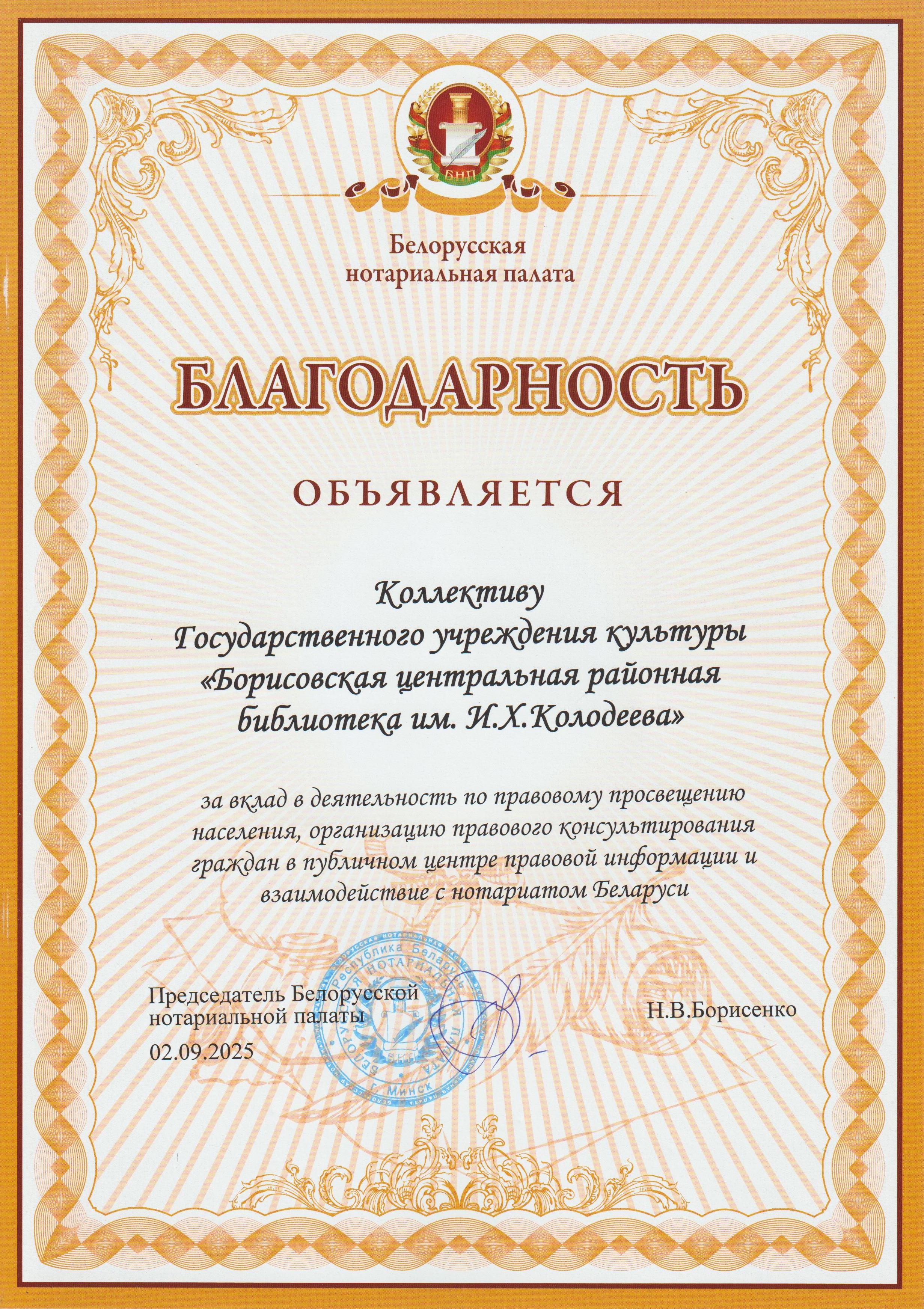 ГРАМОТА Республиканского унитарного предприятия «Издательский дом "Белорусская наука"» Борисовской центральной районной библиотеке им. И.Х. Колодеева за плодотворное сотрудничество по продвижению и популяризации научной и научно-популярной литературы среди пользователей библиотеки