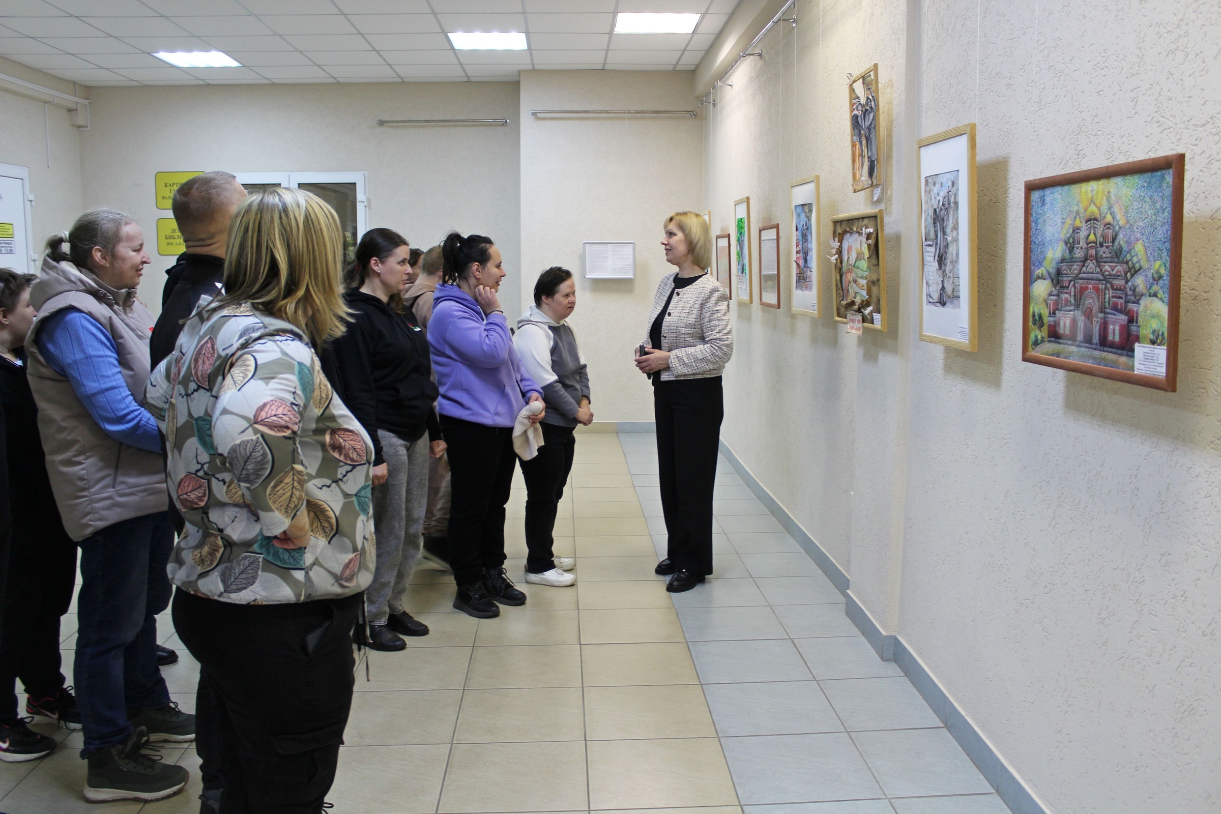 Тематическая экскурсия волонтёра началась с арт-пространства «ARTквартал», где демонстрируется выставка живописи «Здесь тихое счастье живет» борисовского художника-любителя Натальи Адамович. В яркой, наивной манере автор передает живописные уголки родных мест, отмечая в каждом состоянии природы свою красоту.