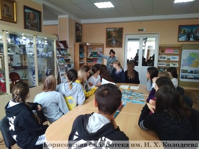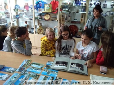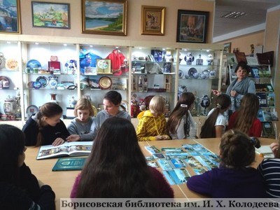 В ходе экскурсии сотрудник отдела галерейно-выставочной деятельности А.Г. Буткевич особое внимание уделила архитектурно-историческим образам Ульяновска и Новоульяновска – городов-партнёров Борисовского района. Также ребята с интересом знакомились с изданиями, представленными на книжно – иллюстративной выставке «Живая память – города-побратимы», рассказывающей о героической борьбе с немецко-фашистскими захватчиками в породнённых с Борисовом городах России, Украины, Латвии и Эстонии.