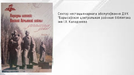 На сектар нестацыянарнага абслугоўвання ДУК “Барысаўская цэнтральная раённая бібліятэка імя І.Х. Каладзеева” паступіла трэцяя кніга Усебеларускай акцыі “Народны летапіс Вялікай Айчыннай вайны: успомнім усіх!”, падрыхтаваная вучонымі Інстытута гісторыі НАН Беларусі.