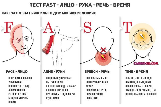 Существует достаточно простой способ, который позволит человеку без специального медицинского образования заподозрить развитие инсульта, тест FAST – означает «Лицо-Рука-Речь-Тест».