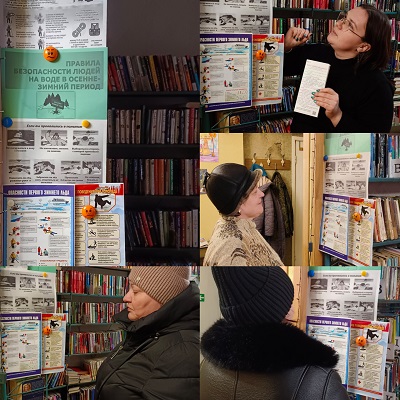 9 января сотрудниками библиотеки № 4 для всех посетителей был оформлен информационный уголок и проведен инструктаж по соблюдению правил безопасности на водных обьектах в зимний период. В первую очередь библиотекари акцентировали внимание детей и взрослых на поведение на льду, как выбраться из полыньи, если попал в неё сам, как помочь человеку, провалившемуся под лёд, ознакомили с характеристиками льда и его коварством в период ледостава. Дополнительно библиотекари проинформировали и предупредили об опасности любителей зимней рыбалки.