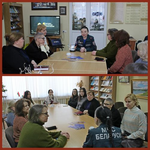 Ольга Радувна напомнила библиотекарям правила безопасной жизнедеятельности в зимний период, привела статистику пожаров по Борисовскому району, проанализировала их причины. Еще раз призвала не оставлять без присмотра детей. Их игра со спичками – одна из причин возникновения пожаров и гибели людей. Рассказала об особенностях печного оборудования и правилах его безопасного использования в повседневной жизни. Особое внимание уделила автономным пожарным извещателям в жилых помещениях. Проинформировала о правильном их использовании. Сотрудники библиотеки проявили хороший уровень осведомленности о правилах безопасности при возможном возникновении возгораний и задавали вопросы по теме. Кроме того, в беседе также была затронута тема безопасного поведения на льду, что очень актуально в зимний период. Завершилось мероприятие демонстрацией видеоролика о правилах поведения во время пожара. Библиотекари получили от сотрудников ГРОЧС тематические буклеты.