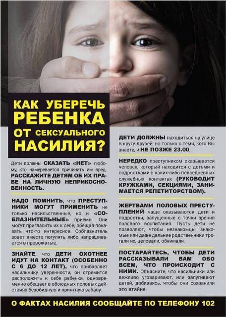 Конечно, выявив у ребенка какой-либо из этих признаков, не стоит сразу подозревать насилие, но если они присутствуют в комплексе, на такого ребенка стоит обратить внимание и деликатно расспросить его о том, что происходит в его жизни. Если же ваши опасения подтвердились, то необходимо сразу же сообщить о преступлении в органы внутренних дел, а ребенку должна быть оказана профессиональная психологическая, медицинская и иная помощь.