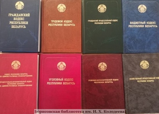 Сельская библиотека № 30 д. Лошница приглашает читателей ознакомиться с новым поступлением таких изданий как «Гражданский кодекс Республики Беларусь», «Трудовой кодекс Республики Беларусь», «Гражданский процессуальный кодекс Республики Беларусь», «Бюджетный кодекс Республики Беларусь», «Хозяйственный процессуальный кодекс Республики Беларусь» и др.