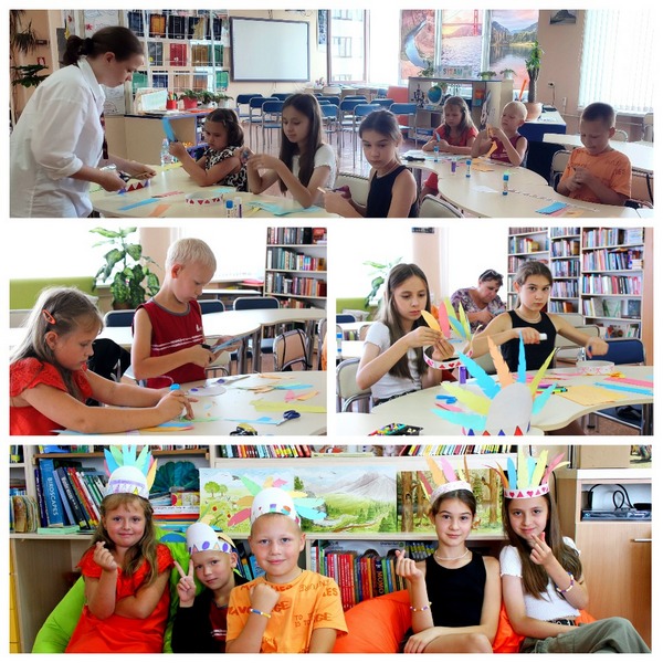 Библиотекарь зала Анастасия Новик приветствовала новых участников и задала им вопрос: знают ли ребята, кто такие индейцы и как они выглядят? Затем каждый участник получил заготовки для изделия и приступил к работе. Используя цветную бумагу, картон и фломастеры, вязальные нити и трубочки для коктейля, ребята погрузились в творческий процесс. Они мастерили головной убор вождей индейских племён Роуч и браслет-оберег на руку.