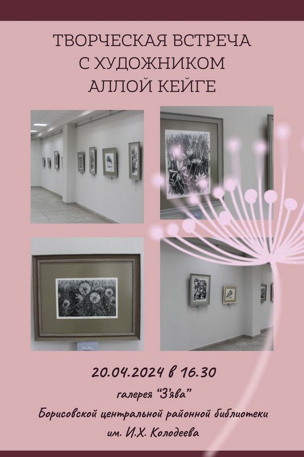 20 апреля 2024 года в галерее «З’ява» Борисовской центральной районной библиотеки им. И.Х. Колодеева прошла творческая встреча с художником из Минска Аллой Кейге. Мероприятие организовано отделом галерейно-выставочной деятельности в рамках её персональной выставки «Тишина». Для профессионалов и любителей современного искусства это была отличная возможность познакомиться с автором и задать ему свои вопросы. Встреча прошла удивительно интересно и тепло.