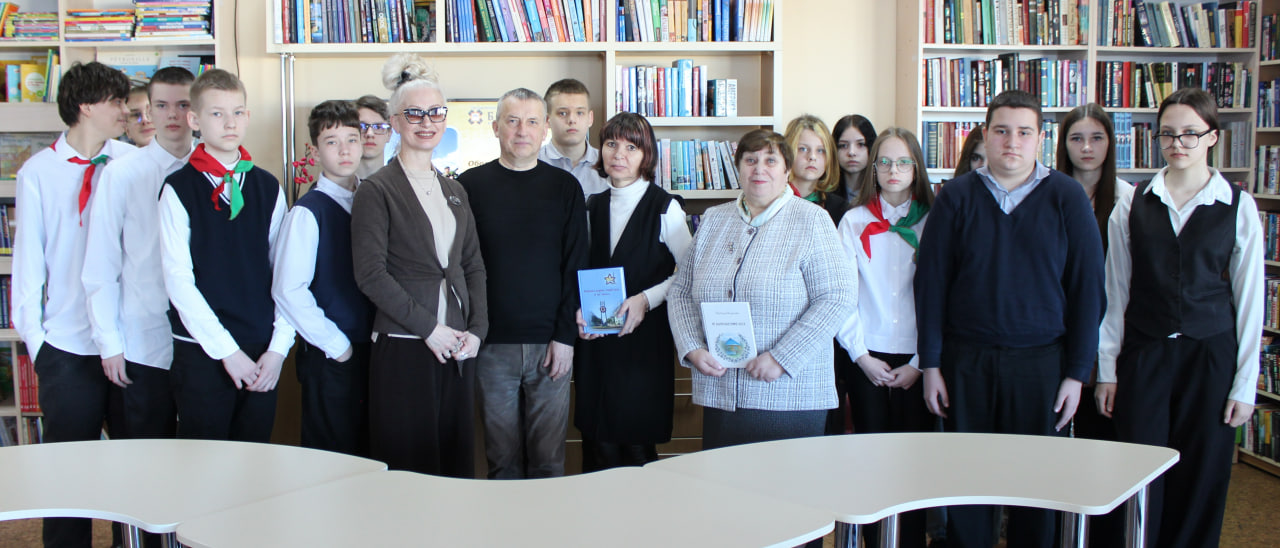 Затем библиотекарь отдела маркетинга, социокультурной деятельности и методической работы, руководитель литературного объединения «Натхненне» Елена Брицкая познакомила ребят с международным коллективным изданием борисовских и московских авторов «Войны дорог тяжёлых я не знал…», которое посвящено 80-летию Великой Победы и вышло в издательстве «Национальная библиотека Беларуси» как раз накануне 9 мая 2025 года. Участник ЛИТО Людмила Волосевич почитала свои стихи из данной книги, рассказала, о каких трагических событиях войны они повествуют.