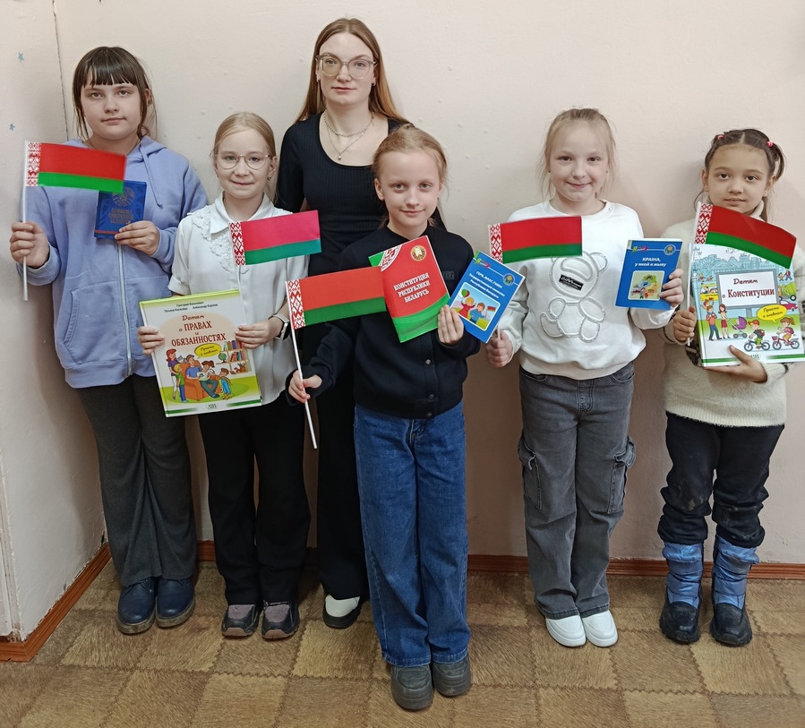 Библиотекарь Ангелина Прокопенко познакомила ребят с историей возникновения Конституции Республики Беларусь и её разделами. Ребята ответили на вопросы викторины «Права и обязанности» и спели гимн Республики Беларусь.