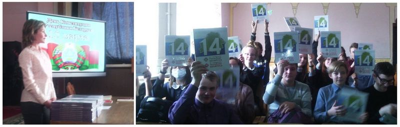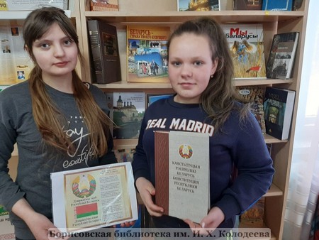 15 марта библиотекарь городской библиотеки № 1 Мария Сакач провела с учащимися 8-х классов ГУО «Средняя школа № 17 г. Борисова» правовой диалог ко Дню Конституции Республики Беларусь «Мир права. Конституция Республики Беларусь». Ребята узнали историю создания Конституции, ее предназначение и роль в современном обществе. Познакомились со структурой Конституции, обсудили основные права, свободы и обязанности граждан Республики Беларусь. Провели дискуссию на тему «Права и обязанности». В завершение мероприятия администрацией школы ученикам в подарок были вручены книги «Я - гражданин Республики Беларусь».