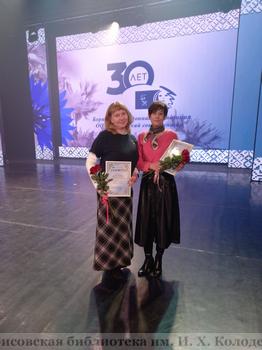 Очень приятно отметить, что для церемонии награждения на сцену поднимались и наши коллеги. Грамотами председателя Борисовской районной организации ОО «Белорусский союз женщин» Анастасии Копиковой удостоены заведующий отделом библиотечного маркетинга Людмила Конашевская и библиотекарь краеведческого центра Людмила Тиханович – за активное участие в общественно-значимых мероприятиях и в связи с 30-летием организации.