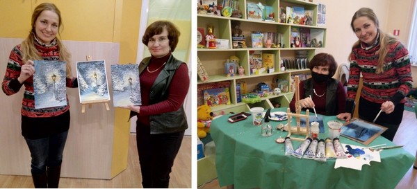 Под чутким руководством профессионального художника, дизайнера, оформителя Татьяны Осининой мазок за мазком ложились краски снежной зимы. Пушистые ели, запорошенные белым снегом и украшенные голубоватым инеем, дорога куда-то вглубь между деревьями не тронута следами человека, птиц и животных… Тишина… И одинокий фонарь в старинном стиле освещает снежный «пятачок» словно неожиданная улыбка зимнего солнышка.