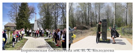 Присутствующие почтили память погибших воинов минутой молчания. После выступил председатель Борисовской районной организации малолетних узников фашистских концлагерей Болотин Сергей Петрович. Также прозвучалии песни военных лет в исполнении Мартинчик Т. Л.
